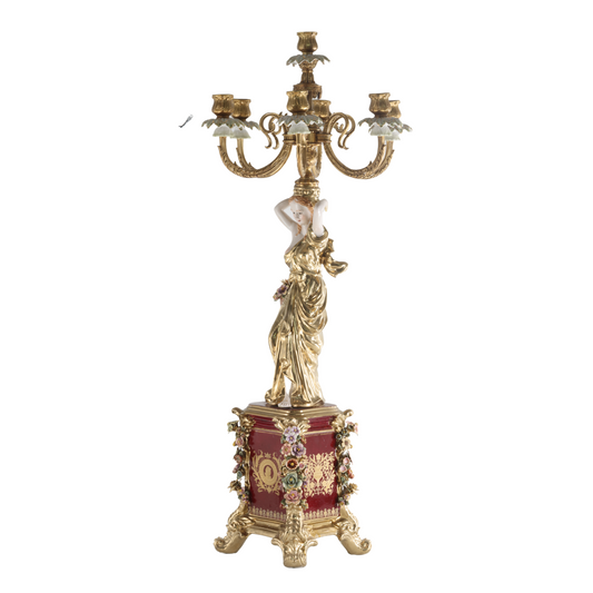 Hand-Painted Bronze Seven Cup Candle Holder With Porcelain Lady