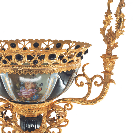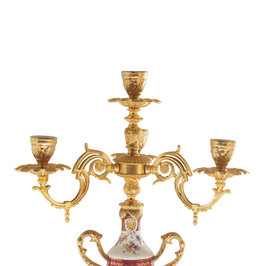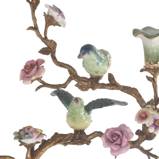 Bronze & Porcelain Hand-Painted Three Cup Candle Holder With Birds